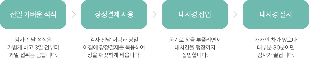 검사 1일 전 안내에 따라 장 세척제를 복용하고 충분한 수분 섭취, 8시간 이상의 금식이 필요합니다.